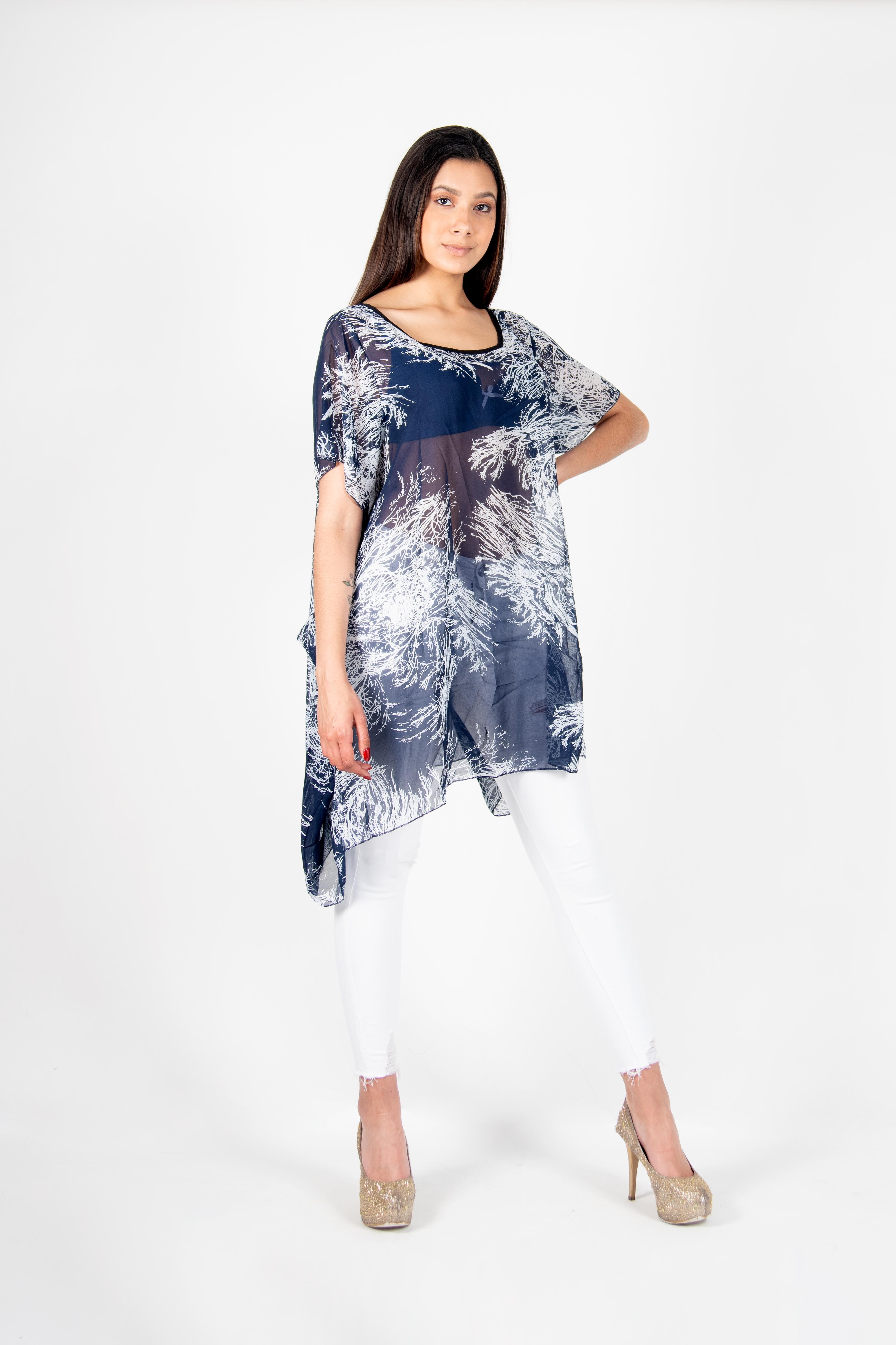 Esta es una bella blusa holgada, de material liviano y traslúcido. La forma de su cuello es en bote. Su corte por inferior termina en punta. Es ideal para usar con un peto lindo por debajo o tu traje de baño/bikini. Viene en distintos estampados y colores.