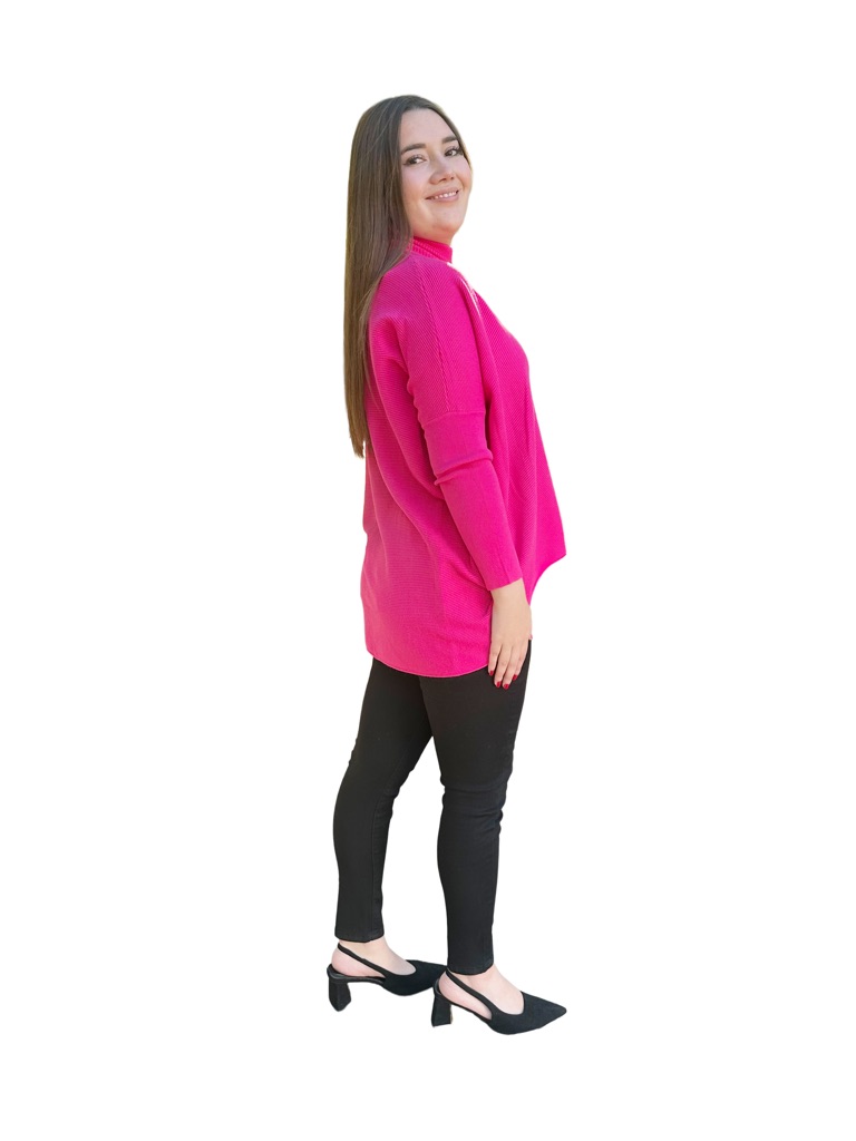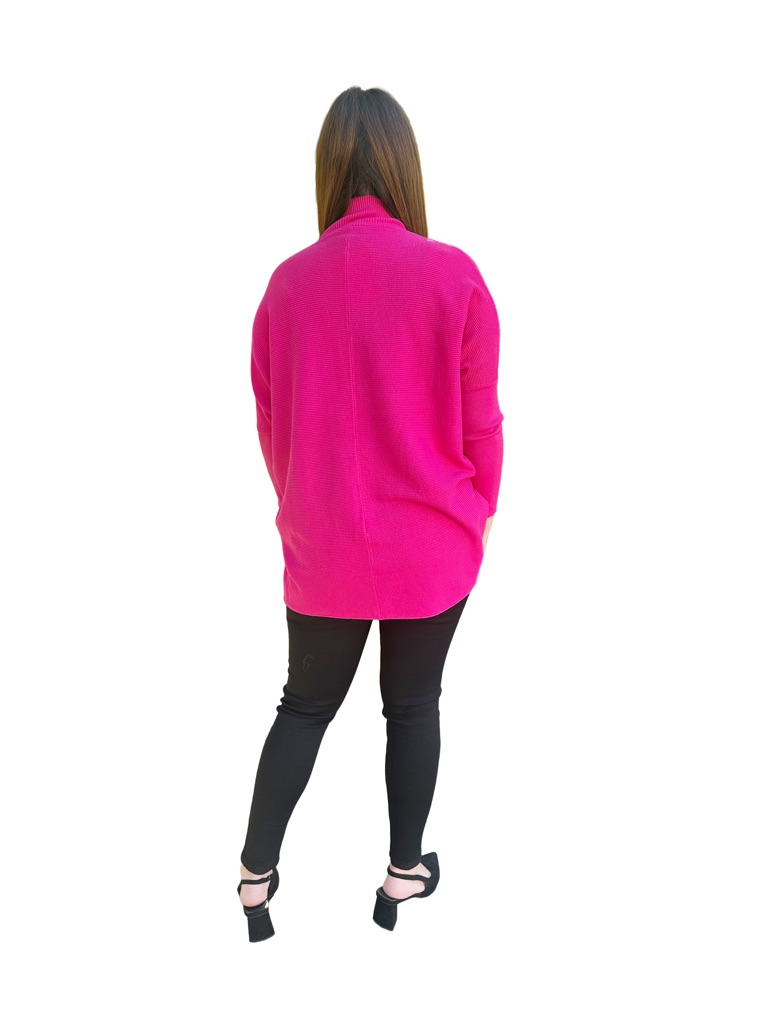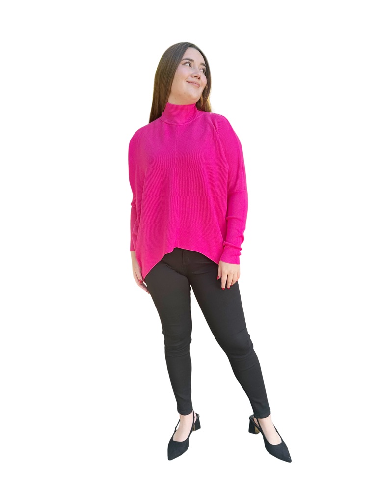 Este es un bello chaleco holgado, largo, que tiene un cuello de altura media, con una línea vertical central anterior y posterior, con relieve de líneas horizontales que llegan hasta la mitad de la manga y luego continua la manga lisa hasta la terminación, la parte posterior es más larga que la anterior. Tiene una hermosa caída.