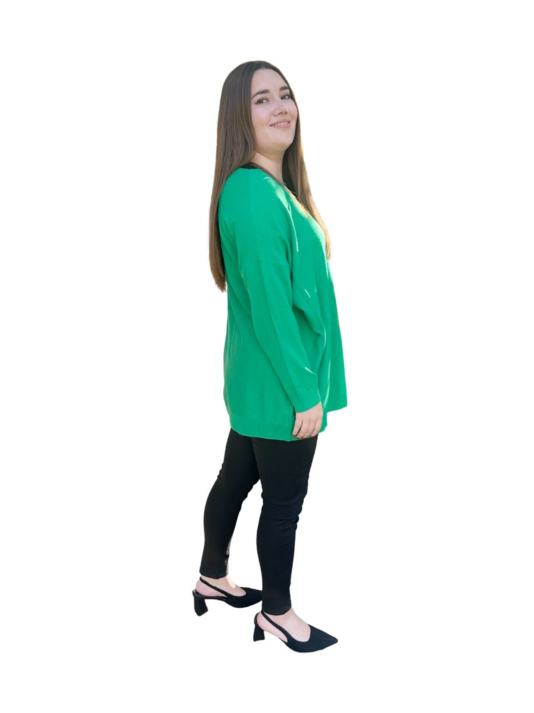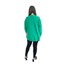 Este es un chaleco de grosor medio, cuello bote, cómodo, holgado de largo medio, con líneas verticales en la terminación de las mangas.