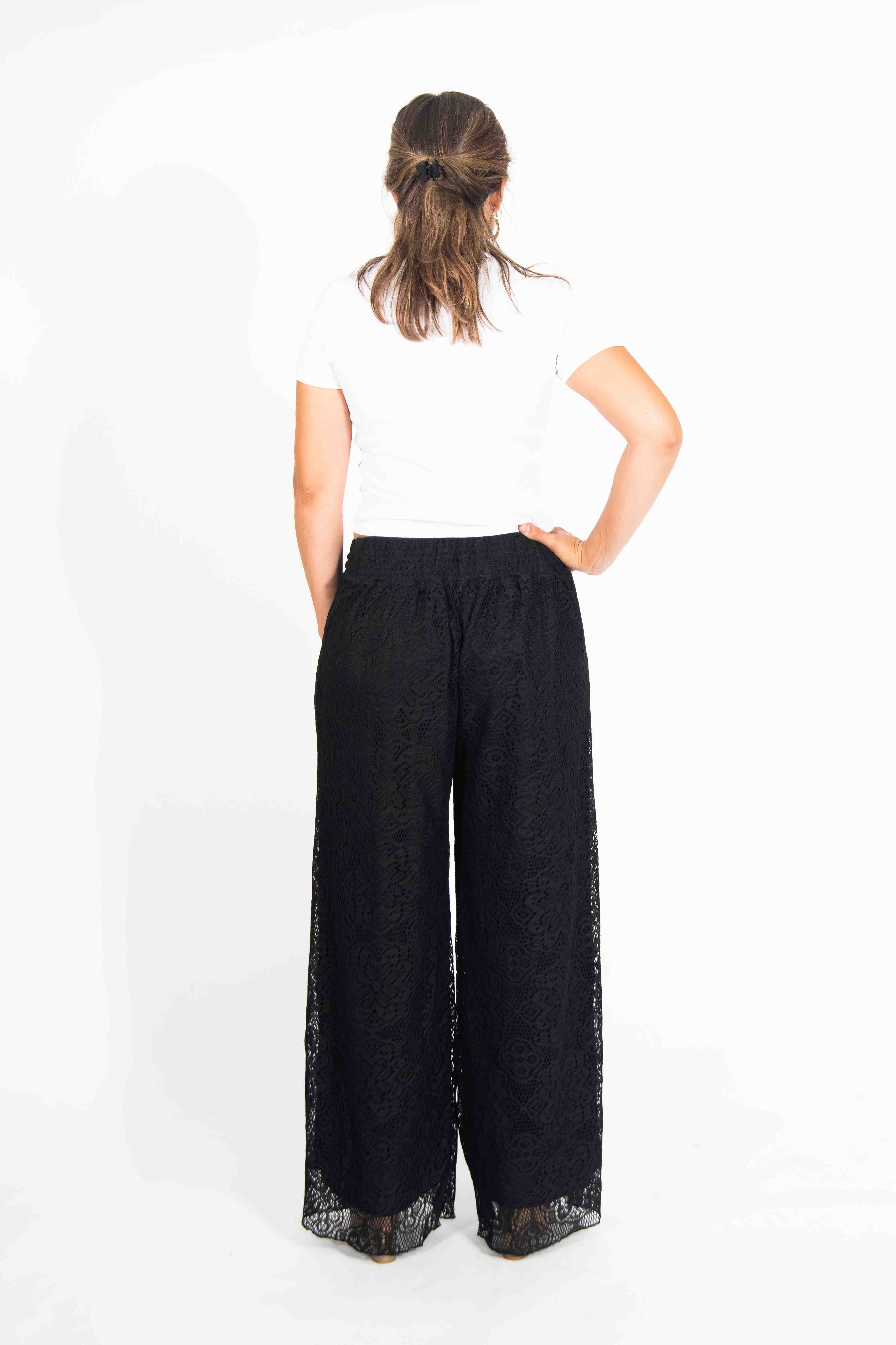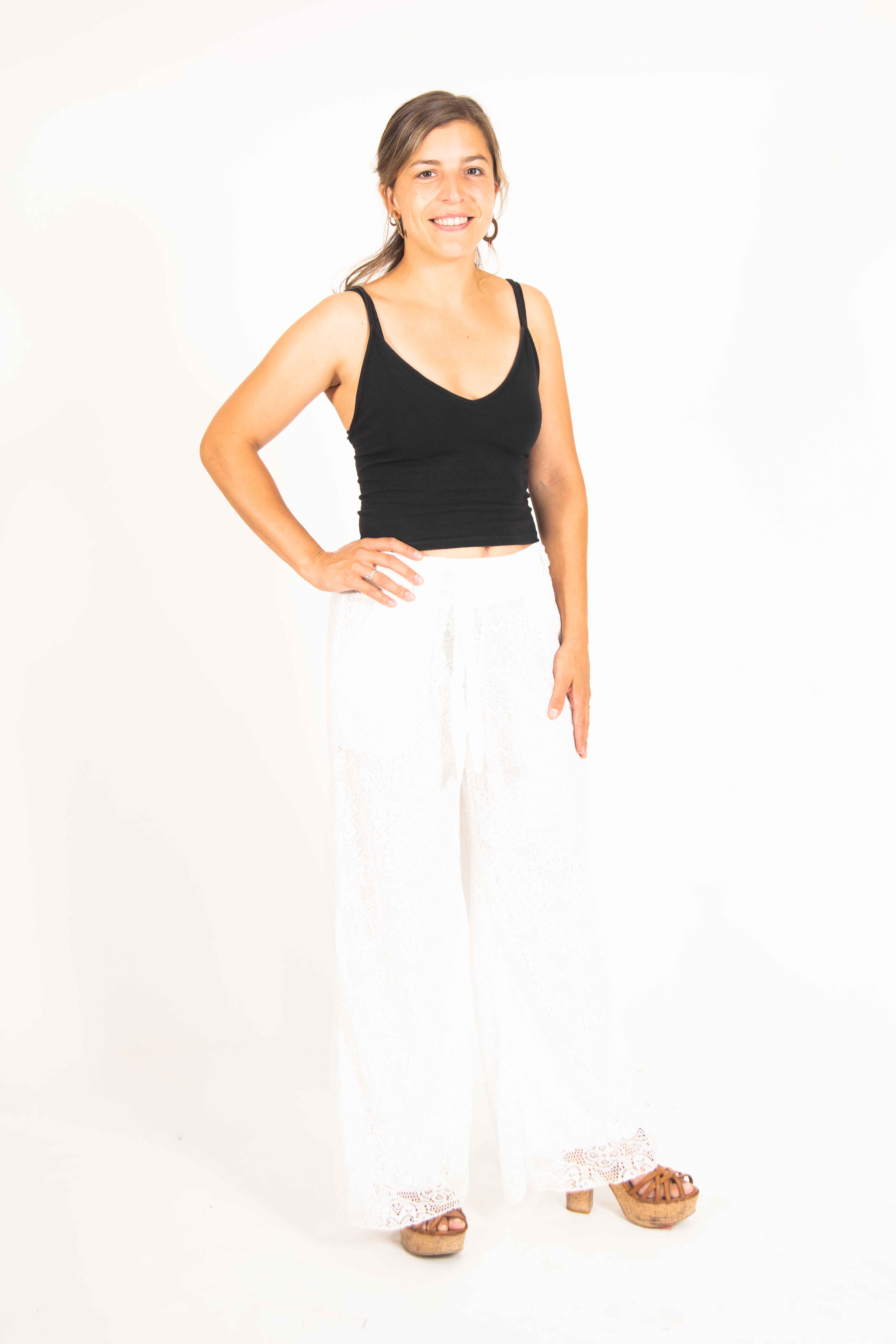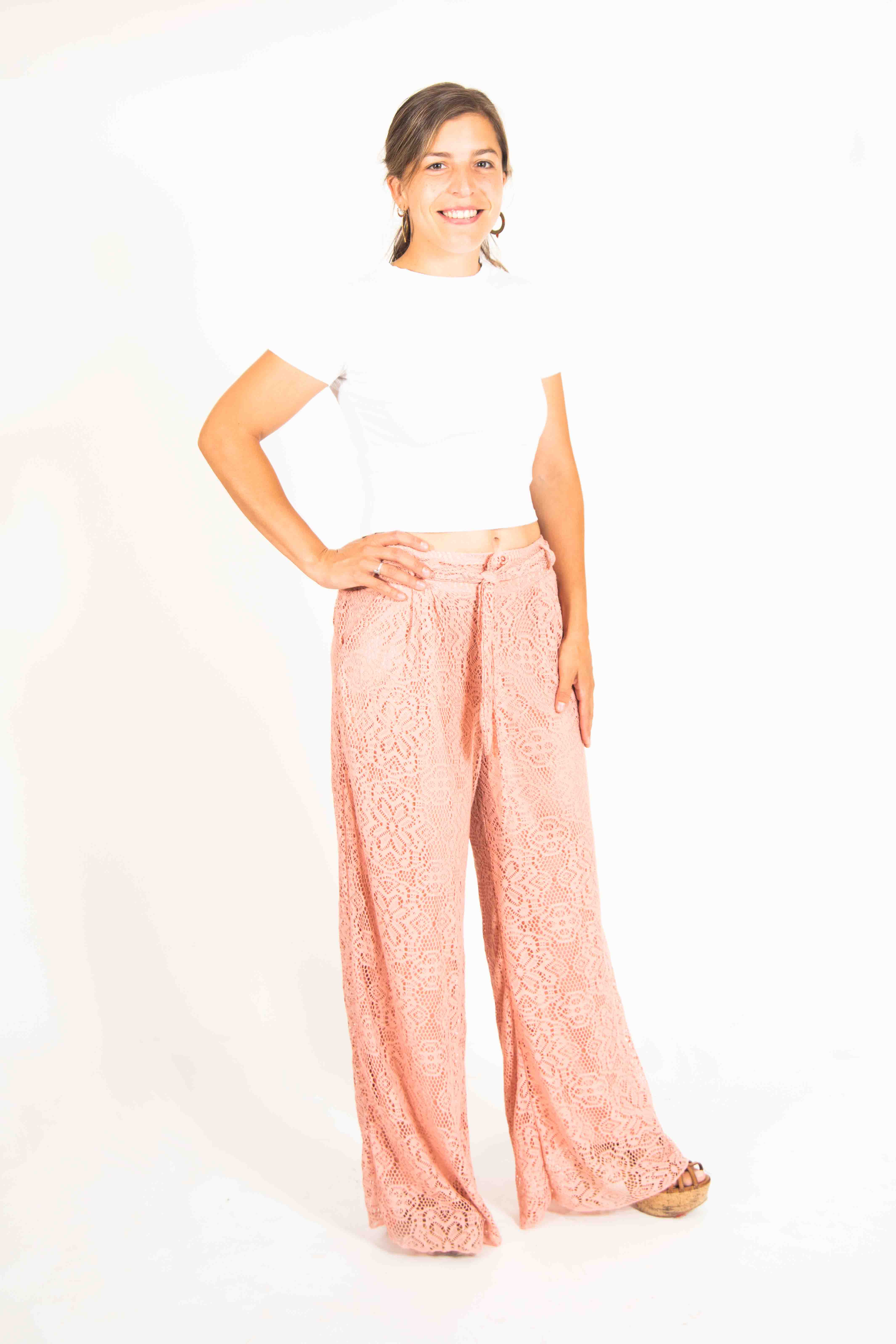Este es un hermoso pantalón, con un exterior de encaje y forro interior largo. Es elásticado y muy cómodo. Viene con un cinturón de tela, del mismo material que la prenda, que puedes dejar o sacar, a tu gusto. Viene en diferentes colores y tallas.